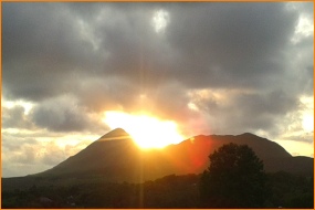 The townland of Boheh, Co Mayo contains a remarkable example of prehistoric rock art, the Boheh Stone, which dates from the Neolithic period (4000-2500BC). The stone can be found along a narrow side road, hidden away behind a derelict house and unkempt vegetation, it is a large natural outcrop of rock known as ‘St. Patrick’s Chair’. Upon its surface (spread out over 4 m²) over 250 individual petroglyphs are carved. They take the form of isolated cup, cup and rings and keyhole archaeological motifs and altogether form a fascinating spectacle when viewed in the right seasonal and lighting conditions. Some of the markings bear close resemblance to those found at New Grange, Knowth and Dowth in County Meath, indicating a Neolithic culture pervading the island of Ireland. Weather permitting, you may be treated to the prehistoric equivalent of a light show. Standing at Boheh Rock/St. Patrick’s Chair between the 22nd and the 24th of August and the 18th April, when looking west, the sun appears to set right on the peak of Croagh Patrick itself. Not only that, but it then subsequently appears, to an observer standing at the Boheh stone, that the sun rolls down the north side of the conical peak itself, revealing the phenomenal ‘rolling sun’ effect.